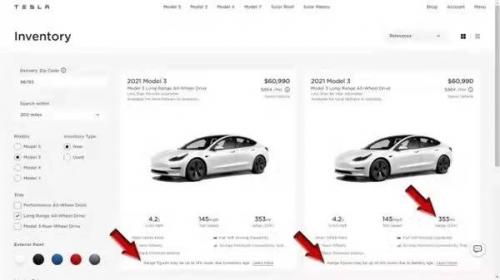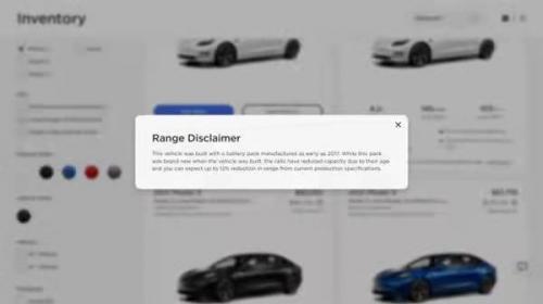 特斯拉将这些车作为新车销售,但在购车页面添加了一句小字警告,点开之后显示:这款车使用了早在2017年就生产出来的电池组,虽然这款电池组件在出厂时还是全新的,但由于电池使用时间较长,电池容量有所下降,与目前的生产规格相比,续航里程可减少12%。