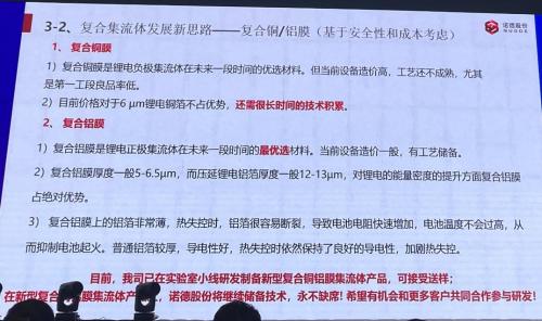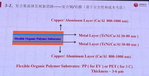 在近期的年度高工锂电会议上,诺德股份展示了其复合集流体最新的相关信息。对于镀金属之前,基膜的材质有两种选择:PP用于动力电池,PET用于3C领域,厚度均在3-6微米。