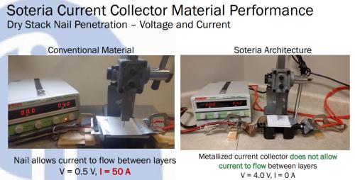 外媒的报道:“Soteria's patented technology replaces the solid foils with metallized polymer films coated with enough metal to run the battery but not enough to deliver the intense current densities that ignite the cell. The metallized films act as a fuse, burning out and isolating the short. Not only does this eliminate thermal runaway, but cells continue to function. ”
