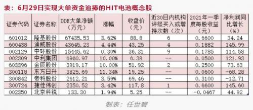 表:6月29日实现大单资金追捧的HIT电池概念股