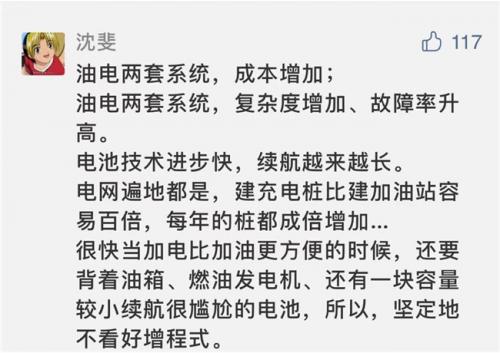 一个是大众集团中国区CEO冯思翰,他曾在公开场合表示:“增程式电动车是最糟糕的方案”;蔚来汽车电源管理副总裁沈斐也曾发文称:“坚定地不看好增程式”。