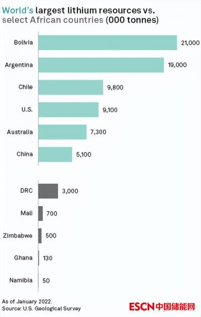 根据美国地质调查局的数据,刚果(金)、马里、津巴布韦、加纳和纳米比亚共有约438万吨锂资源,是非洲主要的锂资源国,英国地质调查局报告也将其归类为“非洲锂供应链中的主要国家”。