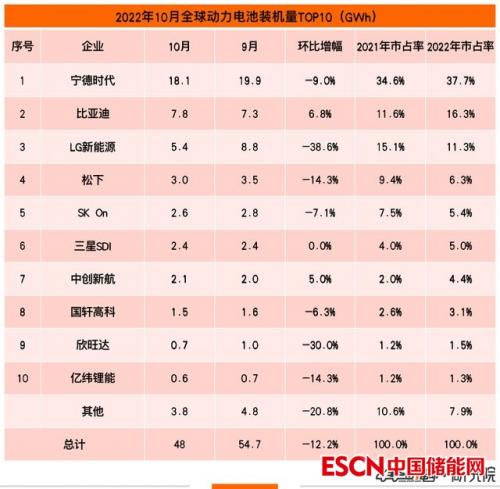 TOP10榜单后四位,仍然是四家中国企业之间的角逐,由于长城汽车销量的下滑,蜂巢能源的装机量也出现了下降,前10月亿纬锂能再次超越蜂巢能源进入前十。如果长城的销量持续低迷,蜂巢能源可能无缘进入2022年全球动力电池市场前十。