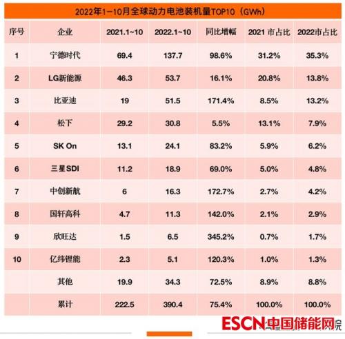 1-10月,全球动力电池装机量390.4GWh,同比增长75.4%。全球排名第一宁德时代增长近一倍,比亚迪等排名前十的中国企业均呈现三位数的高增长势头。以LG新能源为首的韩国企业实现了两位数的增长。相反,包括松下在内的日系企业大部分增长率不及市场平均水平,持续呈下降趋势。