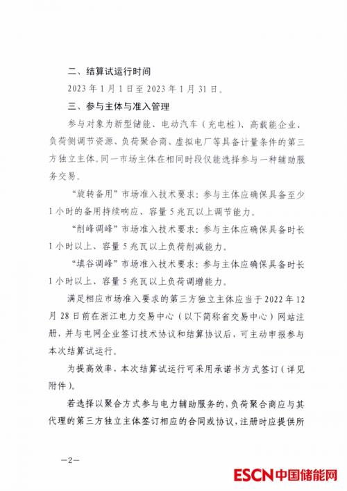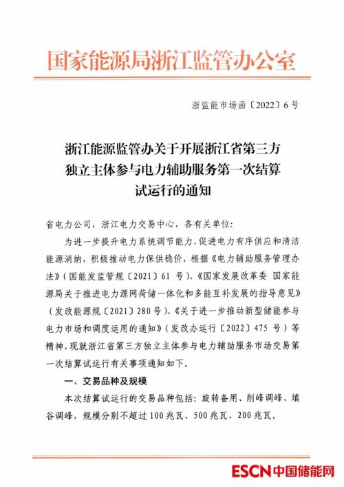 中国储能网讯:日前,浙江能监办发布关于开展浙江省第三方独立主体参与电力辅助服务第一次结算试运行的通知。文件指出,本次结算试运行的交易品种包括:旋转备用、削峰调峰、填谷调峰,规模分别不超过100兆瓦、500兆瓦、200兆瓦。