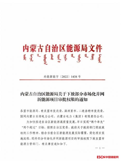 中国储能网讯:12月29日,内蒙古自治区能源局发布了《内蒙古自治区能源局关于下放部分市场化并网新能源项目审批权限的通知》,将部分市场化并网新能源项目的审批权限下发至盟市能源主管部门。