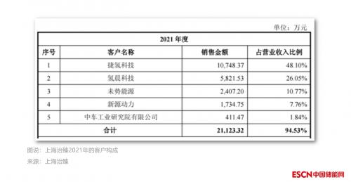 上海治臻的财务数据显示,该公司对前五大客户的销售占比分别为94.07%、96.00%和94.53%。而前五大客户中,捷氢科技占据了半数以上的销售额。