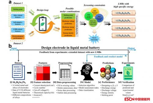 该成果以《机器学习加速设计液态金属电池电极材料》(Accelerated design of electrodes for liquid metal battery by machine learning)为题发表于《储能材料》(Energy Storage Materials, IF=20.831)。西安交通大学金属材料强度国家重点实验室材料创新中心(CAID)为论文的唯一通讯单位,宁晓辉教授为论文的通讯作者,硕士生周涵为论文的第一作者。此研究得到国家自然科学基金委(51874228)、国家重点研发计划(2018YFB0905600)及王宽城教育基金的资助支持。