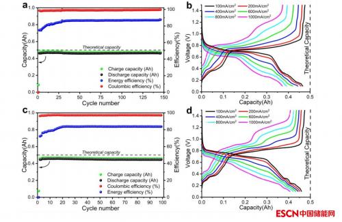 图2 Li||Sb20Bi60Sn10Pb10电池在(a)100 mA cm-2电流密度下的循环性能曲线和(b)不同倍率下的充放电曲线;Li||Sb50Bi30Sn10Pb10电池在(c)100 mA cm-2电流密度下的循环性能曲线和(d)不同倍率下的充放电曲线