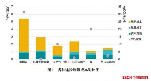 电解水所产氢气为“绿氢”,被认为是氢气生产的最终方向。目前,绿氢成本远远高于其他传统制氢方式,我国不同制氢途径的成本对比如图1所示。