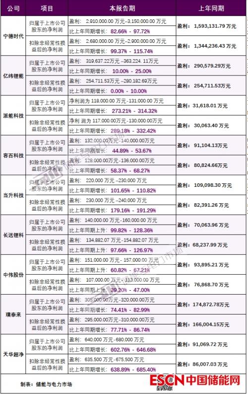 中国储能网讯:日前电池和储能产业链相关企业相继发布2022年业绩预告,包括电池企业宁德时代、亿纬锂能,户用储能企业派能科技,正极材料企业容百科技、当升科技、长远锂科,前驱体企业中伟股份,负极隔膜综合供应商璞泰来,锂盐企业天华超净等。