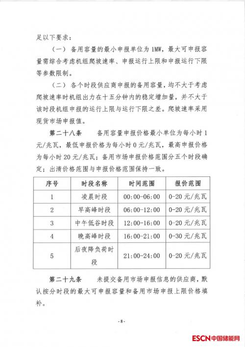 备用容量申报价格最小单位为每小时1元/兆瓦,最低申报价格为每小时0元/兆瓦,最高申报价格为每小时20元/兆瓦;备用市场申报价格范围分五个时段确定;出清价格范围与申报价格范围保持一致。