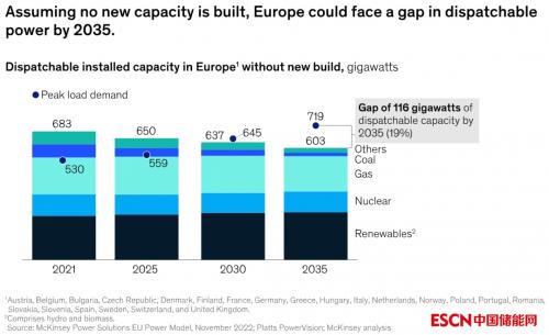 在未来几年中,峰值电力负荷与可启动以满足其需求的可调度电力容量之间将出现差距。随着天然气、核能和水力发电比例持续下降,而电力峰值负荷增加,预计可调度发电容量短缺情况将进一步恶化。到2035年,欧洲的缺口将相当于可调度容量的19%,即116吉瓦。欧洲目前正在努力用清洁的可调度电源能力来源来弥补这一差距。在过去十年中,在公用事业规模的电池系统、生物质和氢气方面进行了大量投资。模型表明,到2035年,将需要超过100吉瓦的储能电池容量、5至10吉瓦的生物质容量和20至30吉瓦的氢电解槽容量来满足峰值负荷。然而,由于依赖支持性法规、政府激励措施的可用性以及对锂等短缺原材料的需求,这些项目的建设面临高度不确定。