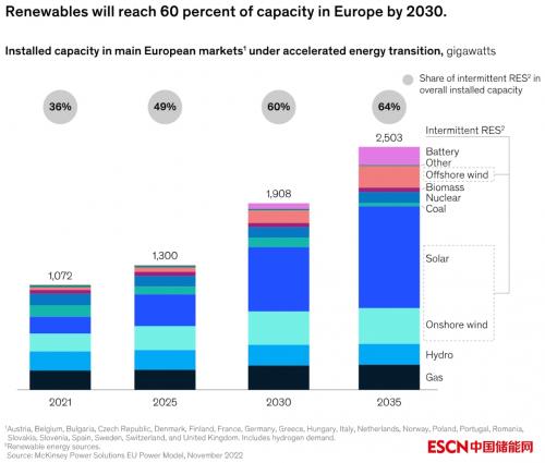 风能和太阳能在欧洲电力结构中的渗透率将大幅增长。到2030年,这些可再生能源是欧洲脱碳努力的关键组成部分,预计将提供欧洲大陆60%的能源容量。这几乎是2021年可再生能源份额的两倍,在2021至2030年间增加760吉瓦。但这并不容易实现,政策制定者、监管机构和可再生能源开发商面对合适的土地和具备所需技能的人才供应短缺,以及供应链问题和原材料短缺的挑战。此外,由于风力和太阳能发电受到自然变化的影响,其间歇性还需要建设平衡资源(如氢气、储能电池、需求侧响应和生物质电厂)。