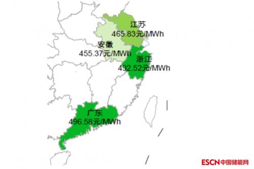 根据公开的绿电成交记录,过去一年各重点省市平均成交价约为:广东496.58元/MWh,浙江492.52元/MWh,江苏465.83元/MWh,安徽455.37元/MWh。