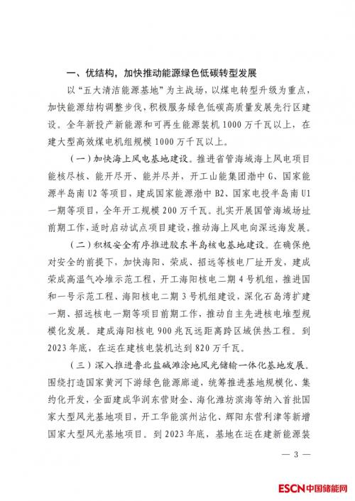 深入推进鲁北盐碱滩涂地风光储输一体化基地发展:围绕打造国家黄河下游绿色能源廊道,统筹推进基地规模化、集约化开发,全面建成华润东营财金、海化潍坊滨海等纳入首批国家大型风光基地项目,开工华能滨州沾化、辉阳东营利津等新增国家大型风光基地项目。到2023年底,基地在运在建新能源装机达到700万千瓦。