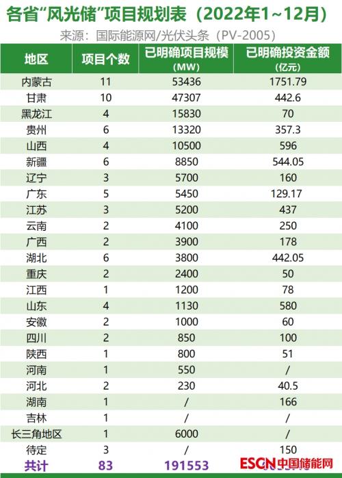 据国际能源网/光伏头条(PV-2005)统计,2022年全国共签约/规划风光储项目83个,已明确的项目规模为191.553GW,已明确的投资金额为6633.46亿元。