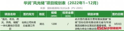 截至2022年12月31日,华润共签约(规划)1个风光储项目,项目规模1.2GW。