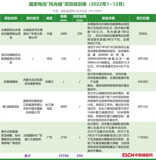 截至2022年12月31日,国家电投共签约(规划)5个风光储项目,明确规模共计10.78GW,有1个项目明确投资金额为250亿元。