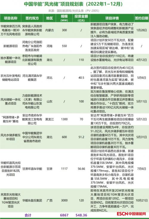 截至2022年12月31日,华能共签约(规划)9个风光储项目,明确规模共计6.867GW,有7个项目明确投资金额共计548.36亿元。