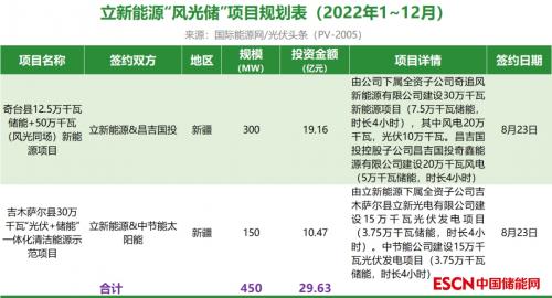 截至截至2022年12月31日,立新能源共签约(规划)2个风光储项目,其中已明确项目规模为450MW,投资金额为29.63亿元。