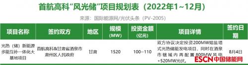 截至2022年12月31日,首航高科共签约(规划)1个风光储项目,项目规模为1.52GW,明确投资金额为100~110亿元(注:统计时取值110亿元)。
