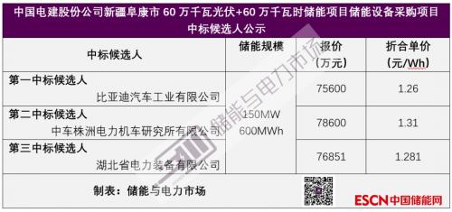 该项目储能规模150MW/600MWh,比亚迪以总报价75600万元,折合单价1.26元/Wh,成为第一中标候选人。