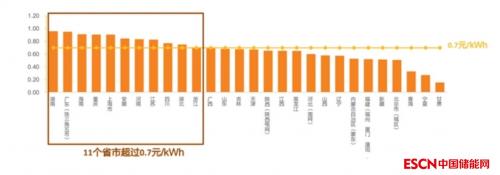 使用储能划不划算,要看——LCOE(度电成本),这个判断工商业储能经济性的指标。当峰谷差价>储能LCOE时,企业安装储能设备自然就可以节省用电成本。理想状态下测算,每天一充一放下储能LCOE≈0.63元/kwh,最新的数据显示,已有11省的峰谷价差超过0.7元/kWh。