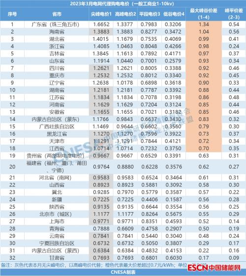 目前,大部分地区已公布2023年3月电网代购电价,CNESA对各地一般工商业10KV的单一制电价进行了汇总测算。现有18个地区的最大峰谷价差超过0.7元/kWh,其中广东省(珠三角五市)和海南省的最大峰谷价差超过1元/kWh,价差变化较大的地区有海南省从2月的0.93元/kWh提高到1.04元/kWh;湖南省从1元/kWh降至0.88元/kWh;河北省南网从0.76元/kWh降至0.61元/kWh,其中,河北省南网3月不执行尖峰电价。另外,甘肃省一直处于价差低位,本月0.17元/kWh创造电网代购电以来的最低价差,甘肃作为外送电大省,省内电力电量平衡相对有保障,用电负荷较平稳。