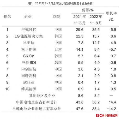 2015年以来,在新能源汽车产业迅速发展和“双碳”目标等的带动下,我国动力电池产业取得了快速的发展,并在全球电池市场占据领先地位。在全球电池市场中,中国、韩国、日本三个国家占据了90%以上的市场份额,形成了三足鼎立的局面。2022年1~8月,在全球动力电池装机量前十名企业中,中国企业有6家,共占58.2%的市场份额;韩国企业3家,日本企业1家,日韩企业合占33.4%的市场份额;欧洲和美国占较少的份额,约为2%。中国电池企业的市场份额持续增长,而日韩电池企业的市场份额呈现下降趋势,LGEnergy Solution(排名第二,以下简称LGES)市场份额从2021年的22.3%下滑至13.7%;松下能源(排名第四)市场份额从14.1%下滑至8.4%;三星SDI(排名第六)市场份额从5.5%下滑至4.9%;仅SK On(排名第五)市场份额从5.7%上升至6.4%。