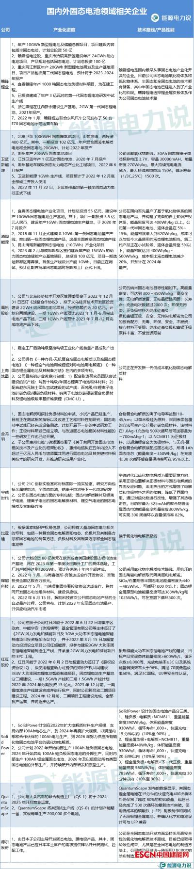 固态电池是当今电池技术领域的研究热点之一。国内固态电池的研发和产业化取得了长足进展。多家企业已宣布自己的固态电池产品研发计划,并在技术创新、产能扩张等方面投入大量努力。目前,国内固态电池行业的主要玩家包括汽车企业和动力电池企业两类。其中,辉能科技、清陶新能源、卫蓝新能源、赣锋锂业和国轩高科等企业是固态电池领域的代表性企业。