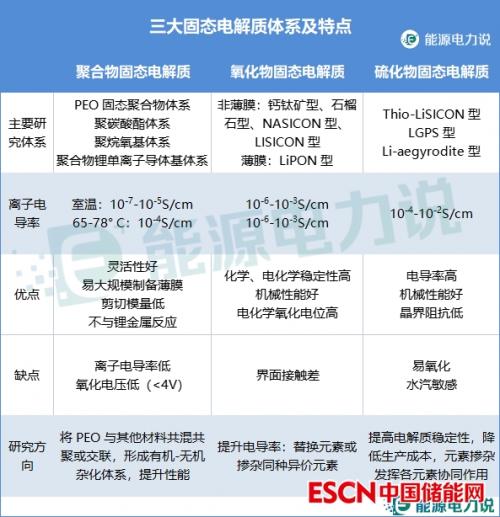 固态电解质是全固态锂电池的核心部件,将取代液态电解质,它决定电池的离子传导性能、界面稳定性和工艺可行性。固态电解质主要分为聚合物、氧化物和硫化物三类,其中氧化物体系研究进展最快、成果最为丰硕。硫化物体系紧随其后,而高能量聚合物体系目前仍处于实验室研究阶段。