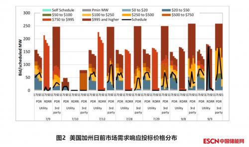 实际上,由于情景不同等原因,国外电力市场价格与需求响应补偿标准呈现出相同的高度相关性。根据美国加州独立操作系统(ISO)市场监管部2022年发布的《2021年需求响应问题和绩效报告》,2021年美国加州电力日前市场不同时间需求响应投标价格分布如图2所示。图中横坐标表示时间,激励型需求响应全年仅发生在7月9日等7天,每次有公用事业和第三方参与需求响应投标,其中公用事业参与又分为可靠性需求响应资源(RDRR)和代理资源响应(PDR)两种类型。纵坐标表示投标减少的电力负荷。图中各色块表示投资价格或激励型补偿水平。可以看出,图中主要色块为暗红色,这个色块表示995美元/兆瓦时及以上价格,而目前加州电力市场价格上限为1000美元/兆瓦时。由于电力短缺情况下电力批发市场交易价格一般会达到上限,可以认为加州需求响应补偿标准与电力市场价格基本相等。