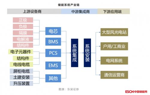 从电化学储能系统产业链来看,上游是电池原材料、电子元器件供应商等;中游是储能系统集成商及系统安装商;下游应用端则是风光电站、电网系统、户用/工商业、通信运营商、数据中心等终端用户。一个典型的电化学储能系统主要由电芯、能量管理系统(EMS)、储能变流器(PCS)、电池管理系统(BMS)四个核心部分构成。