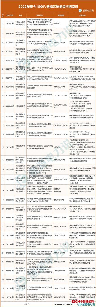 据不完全统计,2022年以来,采用1500V储能系统的招标项目超9GWh,其中“中核汇能有限公司2022-2023年新能源项目储能系统集中采购项目”,采购全钒液流及磷酸铁锂电池储能系统总规模达5.5GWh,明确项目拟采用直流1500V储能系统设计方案。从近期招标项目数量来看,1500V储能系统已成为各发电集团主流储能系统电压等级。