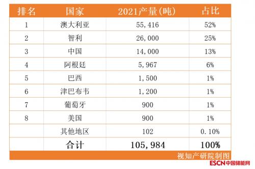 2021年,全球锂产量首次超过100,000吨,是2010年的四倍,其中大约90%来自三个国家。其中,澳大利亚生产了世界上52%的锂,排名第一。