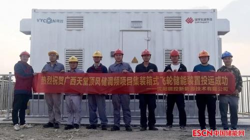 由于广西地区气候多变,尤其是在夏季时节雷暴天气常常出现,新能源场站发电会发生瞬间剧烈变化,导致电网频率波动,对电网稳定运行产生不利影响。此次项目通过单风机配置飞轮储能构成风储一体化调频系统,使风机具备参与电网一次调频、虚拟惯量响应等一系列调频能力,可为电网频率安全提供有效支撑。该项目高速飞轮电网频率调节系统由我国飞轮储能装备制造龙头企业沈阳微控新能源技术有限公司提供。项目采用了高速磁悬浮储能飞轮技术,全部设备采用预制集装箱集成方式,具备响应速度快、充放电频次高、易部署、现场工程量小等优势。微控公司2021年在辽宁阜新实施了国内首个风储协同一次调频及虚拟惯量响应示范项目,在此次天堂顶项目中,针对广西地区气候特点、对系统进行了优化设计,验证了其飞轮储能设备在高温高湿环境下的可靠性及连续稳定运行能力。
