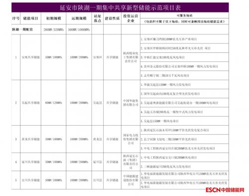 公示显示,一期示范项目共有共有5家企业入围:陕西煤业化工集团有限责任公司、中国华能集团有限公司、国家电力投资集团有限公司、陕西延长石油(集团)有限责任公司和中国能源建设股份有限公司。这意味着5家企业在延安地区储能示范项目的投建上享有优先权。