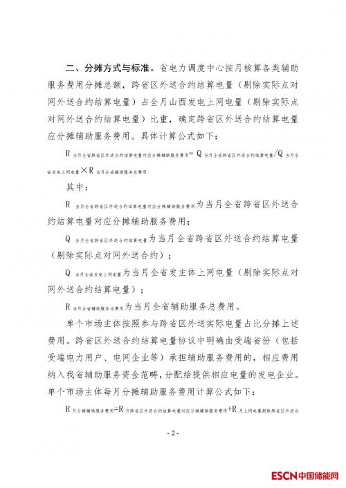 跨省区电力辅助服务费用随跨省区电能量交易电费一起结算。分摊费用按照跨省区外送合约结算电量(剔除实际点对网外送合约结算电量)占全月山西发电上网电量(剔除实际点对网外送合约结算电量)比重计算。
