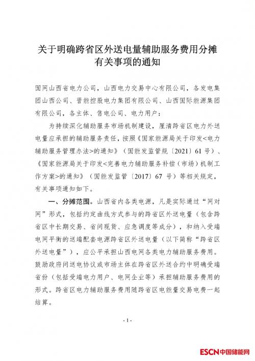 根据该通知,山西省通过“网对网”形式,提供的“跨省外送电量”,需公平承担山西电网各类电力辅助服务费用。包括: