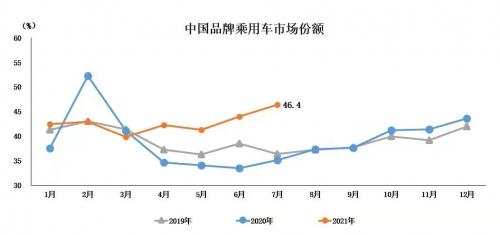 据乘联会最新数据,2021年1-7月中国品牌乘用车销售492万辆,同比增长42.8%,占乘用车销售总量的42.6%,占有率比上年同期提升6.5个百分点。