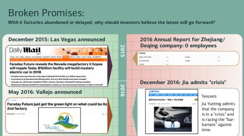 早在2015年,FFIE就已经违背了建设另外5家工厂的承诺,分别位于拉斯维加斯州北部、加利福尼亚州的Vallejo,以及中国的浙江德清、珠海和广州。中国政府文件显示,该公司在其中2个工厂计划投入4.54亿美元资金,并承诺向第3个工厂投资2.5亿美元,但事实上并没有出资。