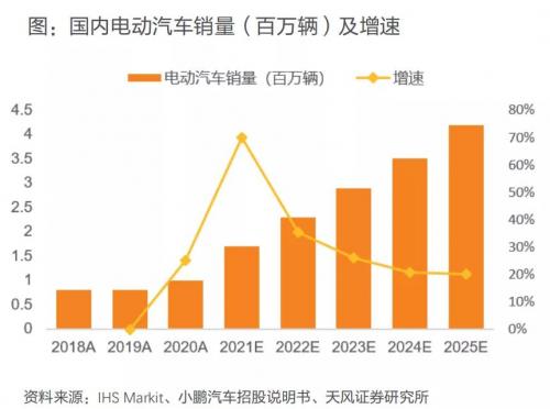 未来五年,中国电动汽车销量预期将从2020年的约100万辆增加至2025年的420万辆,将超过美国及欧洲电动汽车销量的总和,并将长期保持20%以上的行业增速。