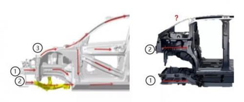 传统车身大概都有三条承力路径,一般中间这条是主力。底盘和座舱分开的设计就必须改变这一分配,从Canoo公布的图上看大概也只有两条路径。这两条路径如何连接,如何分配是一个很大的疑问。再加上它极短的前悬结构,相信挑战会更大。