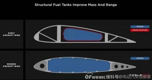 马斯克举了飞机油箱(下图)的例子,来说明电池包与车身结构的融合。概念上确实如此,飞机油箱从机翼+油箱变为机翼=油箱,所以车身+电池包也可以变成车身=电池包。而油箱和电池包的区别就在于燃油是液体,电芯则是固体。当然也因为电芯本身的壳体结构,让它有条件成为整体承重结构的一部分,马斯克的类比看起来没毛病。