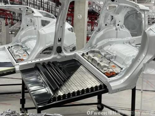 回到电池,我们看到特斯拉structure battery中,一个个圆柱电芯被紧密的排列在中地板下方,而应该是电池上盖的部分还长出了与门槛搭接的横梁结构。