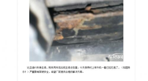 投诉编号【661086】显示:比亚迪F3 (2015款1.5L手动豪华型节能版)车身生锈,购车两年后出现生锈没在意。今天保养时上举升机一看已经烂透了,(如图所示!)严重影响驾驶安全,希望厂家提供合理的解决方案。