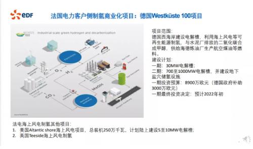 法国电力同样也非常重视绿氢发展,集团有一家全资子公司HINAMIC(音),负责绿氢项目的实施。目前正在德国规划第一个氢能项目——德国Westküste 100项目,Westküste是英文Westkuzt(音),是西哈含(音)的意思,这个项目实际上是一个客户端项目,它的客户是一个炼化厂,德国海合(音)炼化厂。利用德国北海丰富的海上风电或其他可再生能源来建设电解槽制氢和氧气,氧气输送给附近的一家水泥厂,在负氧锅炉里燃烧生成高浓度的二氧化碳,收集的二氧化碳和氢气合成甲醇,再把甲醇提供给炼化厂,生产高附加值的航空煤油等能料。