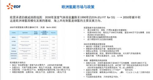 首先,欧洲氢能市场和政策。欧盟承诺了碳减排路线图分两步走:第一步,2030年承诺,温室气体排放量降至1990年的55%;第二步是2050年,实现碳中和。欧洲在研究过程中发现,电能在终端能源消费比例是比较低的。以法国为例,是27%至28%,而且这一比例维持了二三十年。而多达70%的终端能源消费是以油气为主的化石能源。