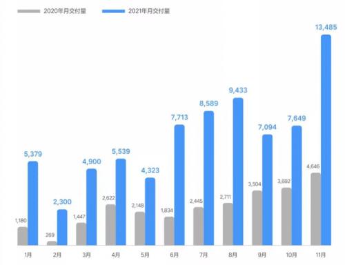由柱状图也可以看到,大众在这两年时间里,也开始向电动化转型(推出ID系列产品),但整体销量没有太大起色。相反,理想ONE凭借一款产品,却奋进高歌一路向上,11月首次突破万辆,1-11月累计交付76,404辆。李想要讲述的,似乎是一个龟兔赛跑的故事。